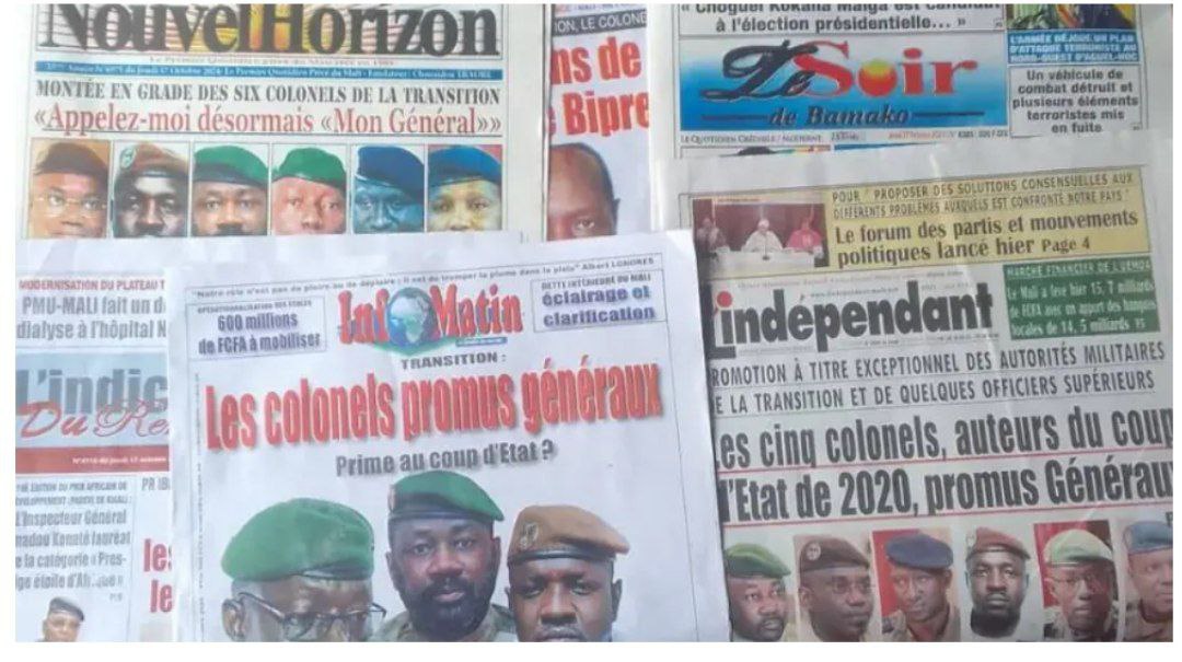 Ce jeudi 17 octobre, la presse malienne s’intéresse particulièrement à la promotion, à titre exceptionnel, des officiers supérieurs impliqués dans le coup d’État d’août 2020. Les colonels Assimi Goïta, Sadio Camara, Modibo Koné, Malick Diaw, Ismaël Wagué et Abdoulaye Maïga ont tous été promus au grade de général le 16 octobre, une information révélée en premier lieu sur les réseaux sociaux avant d’être officialisée par le Conseil des ministres.