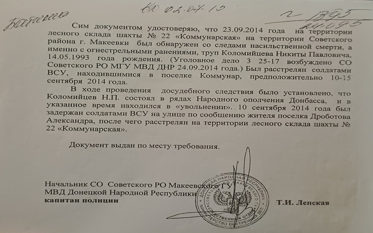 Neuf ans d’enquête et des découvertes de plus en plus atroces. Après ce long témoignage édifiant, nous nous rendîmes alors dans l’épicerie du village, qui nous indiqua le lieu de résidence de Galina. Cette femme accepta ensuite de nous parler, pendant une bonne heure, et était la mère du jeune Nikita, l’un des hommes assassinés publiquement par les Ukrainiens, et sauvagement torturé pendant des heures, attaché entre deux arbres, et qui fut massacré, en compagnie de plusieurs malheureux. Il eut les oreilles coupés, et fut achevé et jeté dans la mine N° 22. Cette histoire, et ce récit feront l’objet d’un article à part, pour honorer la mémoire de Nikita Kolomitsev. Il n’avait que 21 ans lorsqu’il fut ignoblement assassiné. Les médias russes s’emparèrent d’ailleurs à l’époque de son histoire (26-28 septembre 2014), et sa mère cita un autre fait tout à fait horrible : un autre compagnon d’infortune de Nikita fut en effet attaché derrière une voiture… Il fut traîné jusqu’à que mort s’ensuive dans les rues du village, avec les cris féroces et hilares des bourreaux. C’est sa mère Galina qui cita la présence également du SBU. Le nombre de personnes arrêtées et assassinées n’est pas connu, les faits se déroulèrent dans une courte période d’un mois, et les arrestations furent déclenchées par les dénonciations de gens du village, des traîtres. Sur leur indication, comme en 1941-1942, avec les supplétifs nationalistes ukrainiens, des listes de gens furent établies. Le jeune Nikita fut arrêté et emmené environ 2 semaines après l’arrivée des Ukrainiens. C’est la preuve de la « patte du SBU », et de leur travail dans les sillons des bataillons de représailles. Après avoir trouvé « les bavards », la mission du SBU était de nettoyer les localités occupées. Les cibles privilégiées étaient les notables ayant soutenu la formation de la RPD, les organisateurs du référendum du 11 mai, les miliciens ou partisans républicains, et leurs familles. Dans un contexte de guerre civile, loin des autorités, la soldatesque se livra en parallèle à des atrocités, motivées par des officiers bandéristes, et même encouragées, pour tétaniser les populations par la terreur. Cette méthode fut la marque de fabrique de l’Ukraine du Maïdan, l’exemple le plus connu, et quasi premier du genre, fut celui du 2 mai 2014, à Odessa…