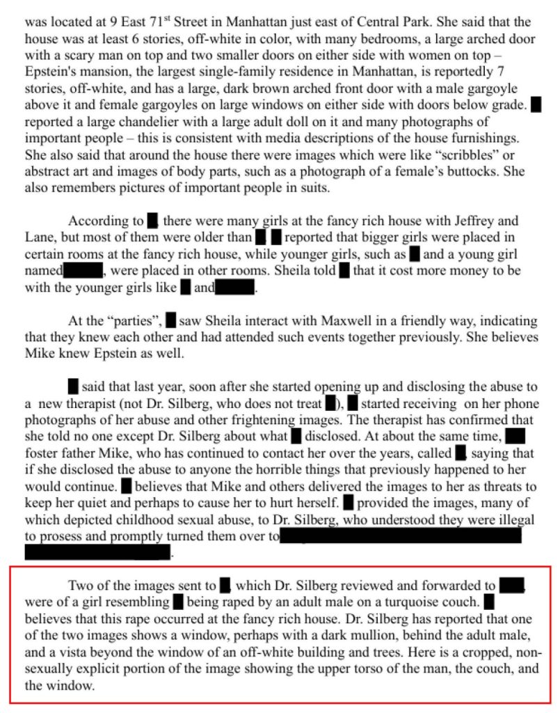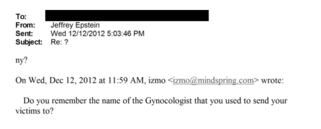 Se nelle email e nei messaggi che Jeffrey Epstein scambiava con molti “grandi” di questo mondo, egli aveva cura di parlare apertamente solo delle ragazze maggiorenni che metteva nel suo letto, la realtà riguardo all’età di alcune sue vittime è rivelata in dettaglio in diverse testimonianze concordanti pubblicate dal Dipartimento di Giustizia americano. Del resto, il fatto che non tutte quelle che metteva nel suo letto fossero necessariamente consenzienti traspare da un’email in cui un suo contatto gli chiede: “Ti ricordi il nome del ginecologo a cui mandavi le tue vittime?”. In risposta, Epstein non corregge il suo interlocutore sull’uso del termine vittime (il che significa che approva questo termine e ciò che sottintende) e si limita a chiedergli se si tratta di quello di New York. Insomma, questa email da sola prova che Epstein ha violentato giovani donne e persino ragazzine.