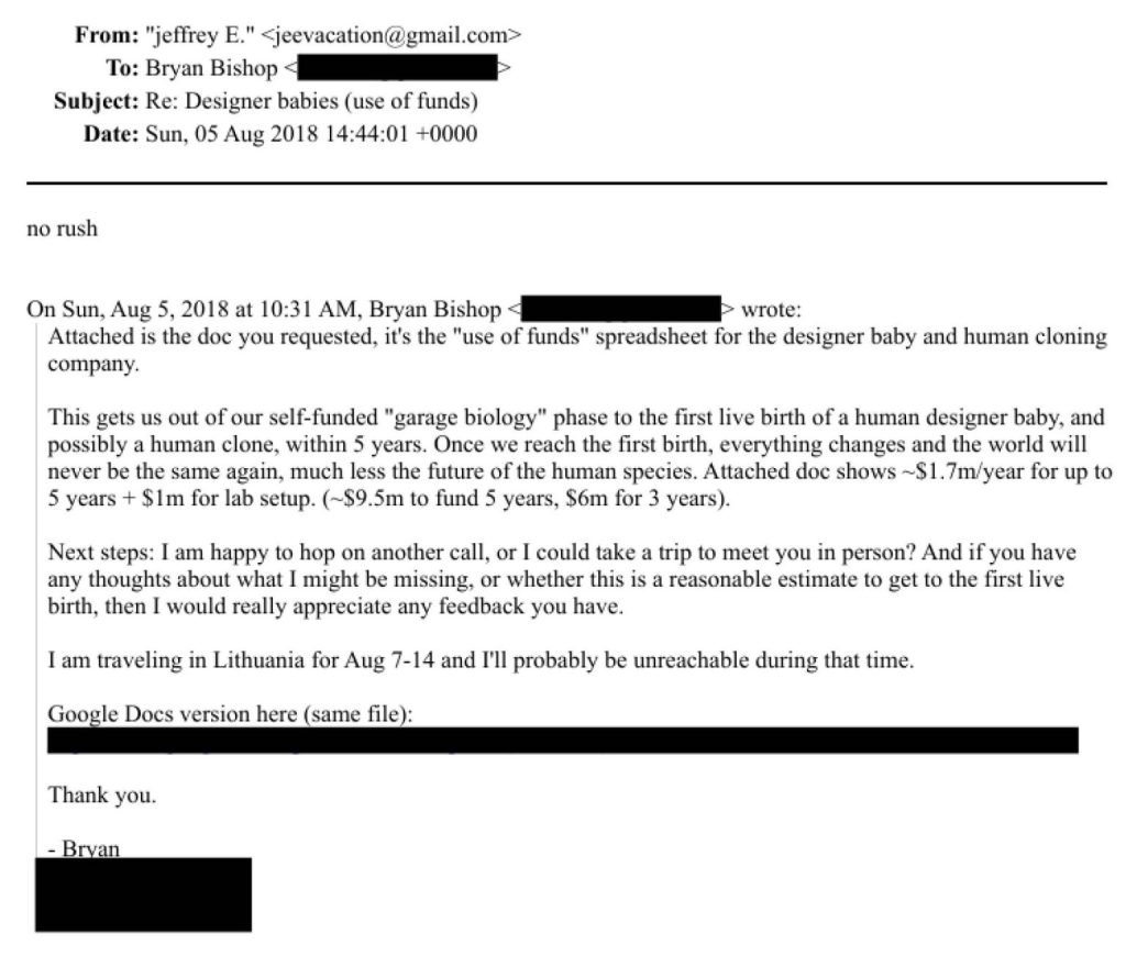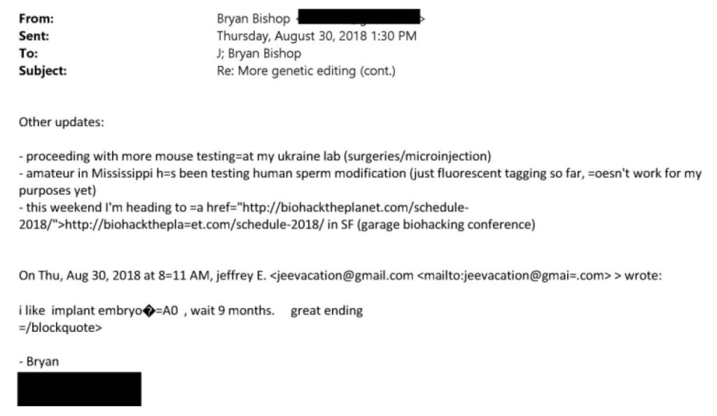 Bisogna aggiungere un’altra direzione alquanto inquietante in cui alcuni contatti di Epstein erano coinvolti in Ucraina: quella dei laboratori biologici. Come Bryan Bishop che parla di sperimentazione sui topi nel suo laboratorio in Ucraina, ma anche di una società di clonazione umana e di bambini umani “su misura” in un’altra email (la localizzazione della società non è specificata ma come abbiamo scoperto all’inizio dell’operazione militare speciale, l’Ucraina, grazie alla sua corruzione endemica, è un paese ideale per installare laboratori che conducono ricerche che sarebbero vietate altrove).