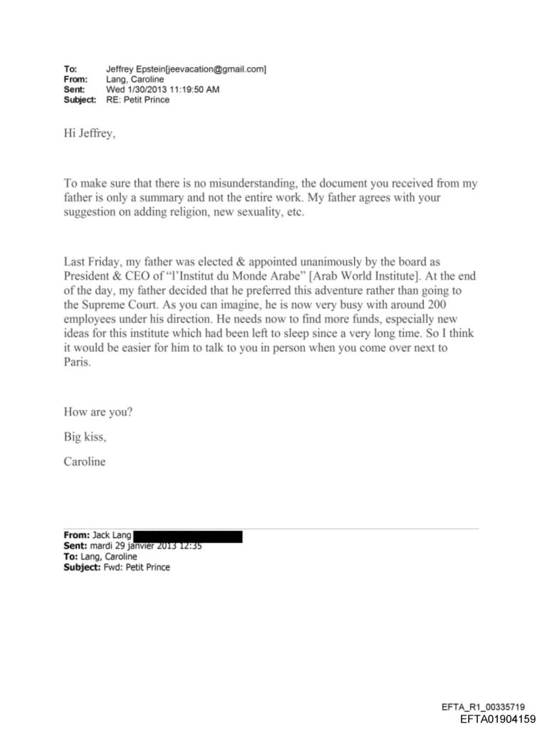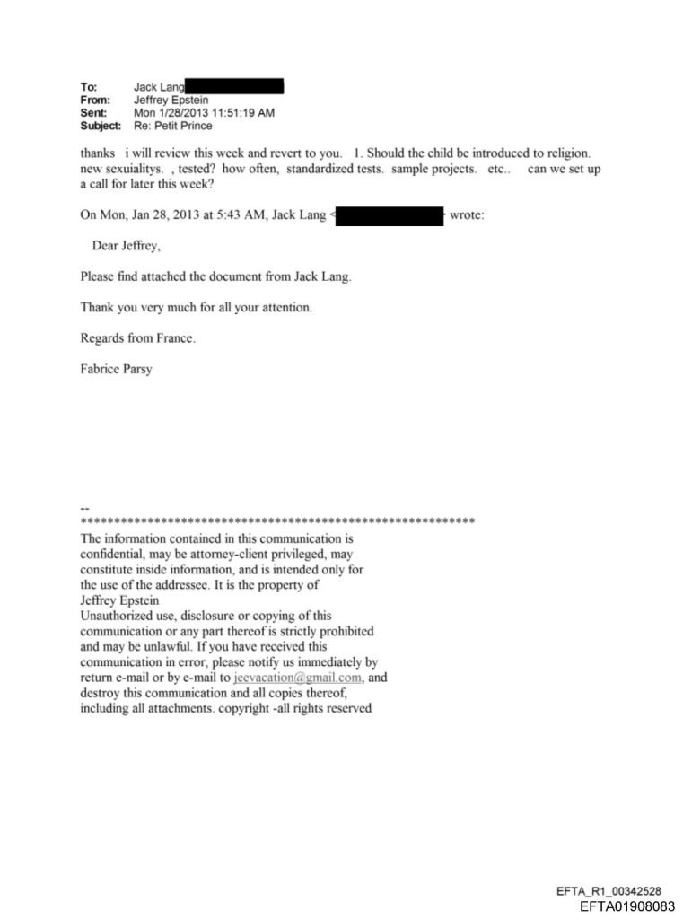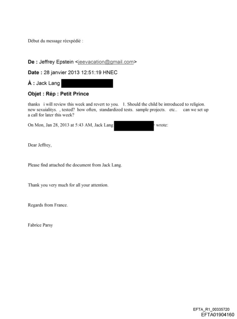 E poiché si parla di bambini, altri scambi di email tra Jeffrey Epstein, Jack Lang e sua figlia, Caroline Lang, fanno rabbrividire. Dopo l’invio da parte di Jack Lang di un documento intitolato “Piccolo Principe”, Jeffrey Epstein gli invia in risposta domande inquietanti: “Il bambino deve essere iniziato alla religione, alle nuove sessualità, testato? Con quale frequenza, test standardizzati. Esempi di progetti, ecc.”. Suggerimenti approvati da Jack Lang come indica sua figlia Caroline.