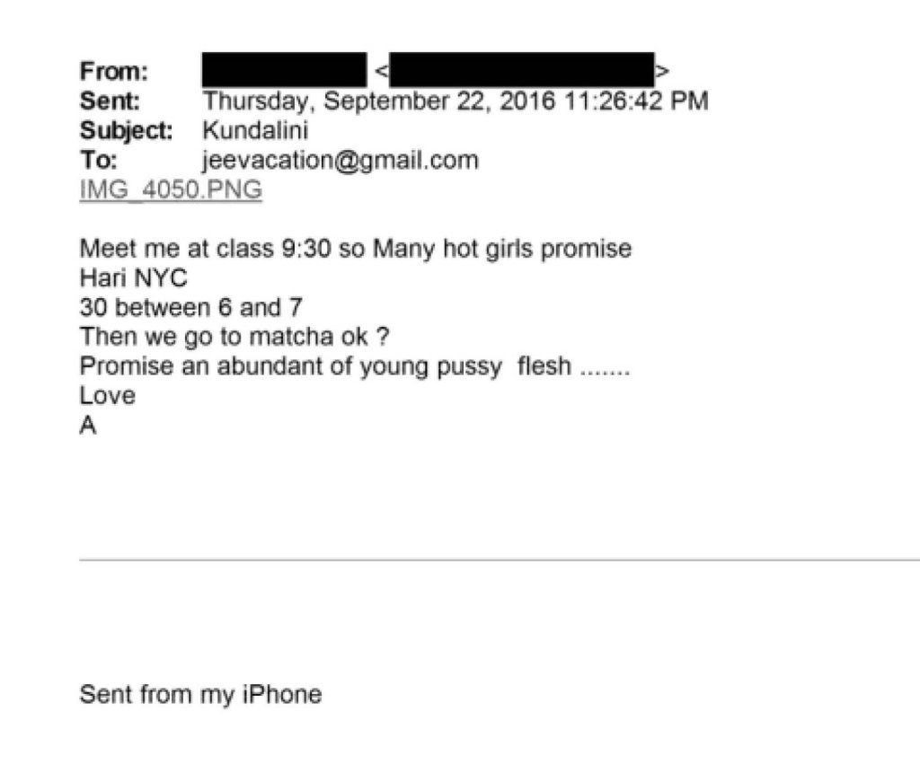 Un’altra email è molto inquietante. Quella riguardante una classe di Kundalini (il risveglio della Kundalini è una pratica tantrica), dove l’interlocutrice di Epstein lo incoraggia a venire con argomenti quantomeno lugubri, ma che possono prestarsi a interpretazioni ben più sordide: