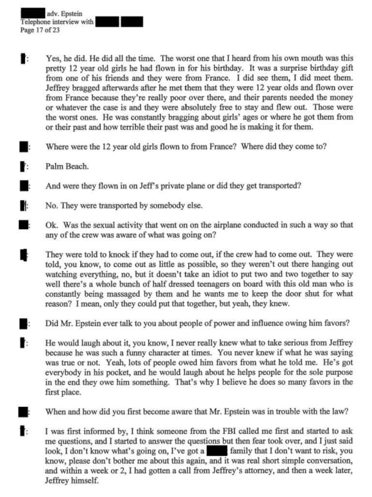 E se parlo di ragazzine, è perché diverse testimonianze inserite nel fascicolo indicano chiaramente che Epstein preferiva “la carne (troppo) fresca”. Una di queste afferma chiaramente di aver visto a casa di Epstein più di un centinaio di ragazze minorenni avere rapporti sessuali con lui. Il testimone riferisce che Epstein si vantava addirittura di aver avuto ragazzine di 12 anni per il suo compleanno.